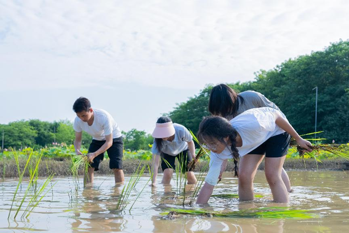 6月5日适逢农历二十四节气中的芒种,有经验的农事师傅带领大家亲自挽起裤腿,下到水田里。在讲解稻作基本常识之后,营员们和师傅一同开展了中稻插秧活动,在插秧中亲身体会到了“粒粒皆辛苦”的深意,增强了对农耕文化的认同感和敬畏之心。